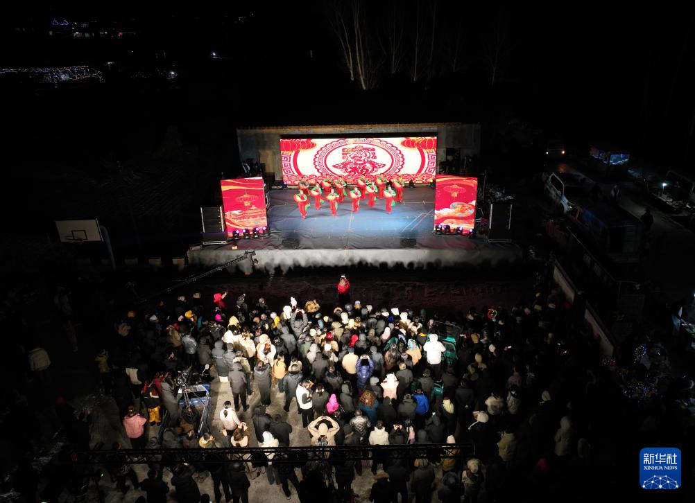 在遼寧省朝陽市朝陽縣北四家子鄉唐杖子村,“村晚”聯歡開場(2月2日攝,無人機照片)。