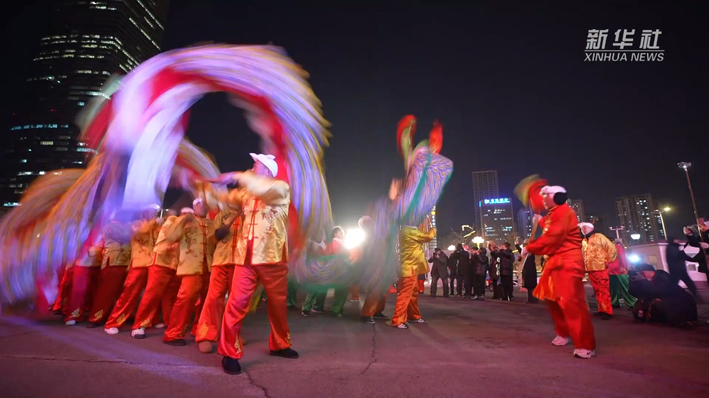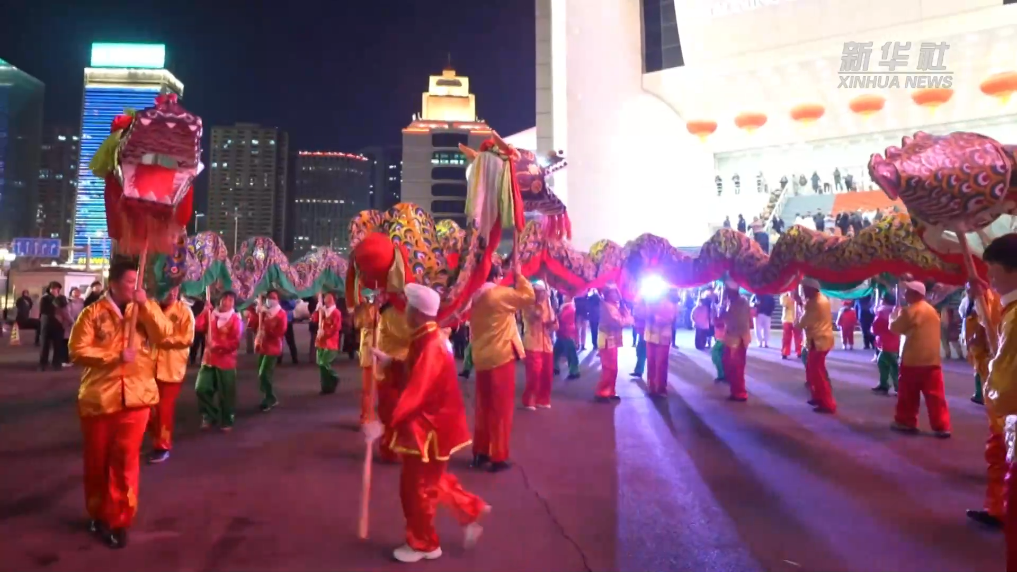 在沈陽人民廣場,伴隨著鼓聲咚咚、嗩吶聲聲,兩條“巨龍”時而騰躍沖飛、蜿蜒遨游,在當地聞名遐邇的張氏皇苑龍盡情鬧元宵。