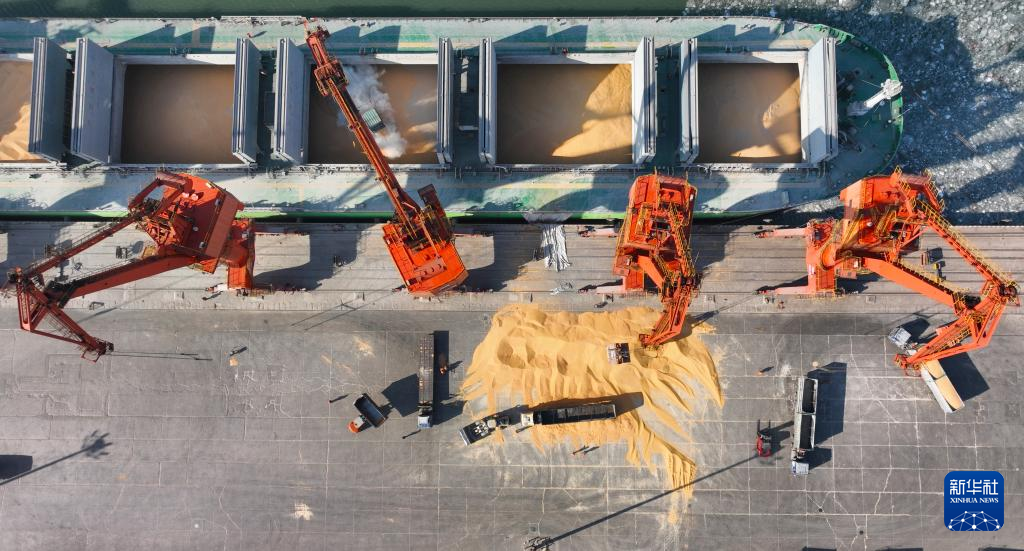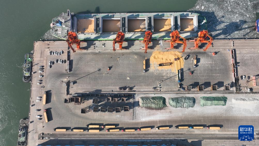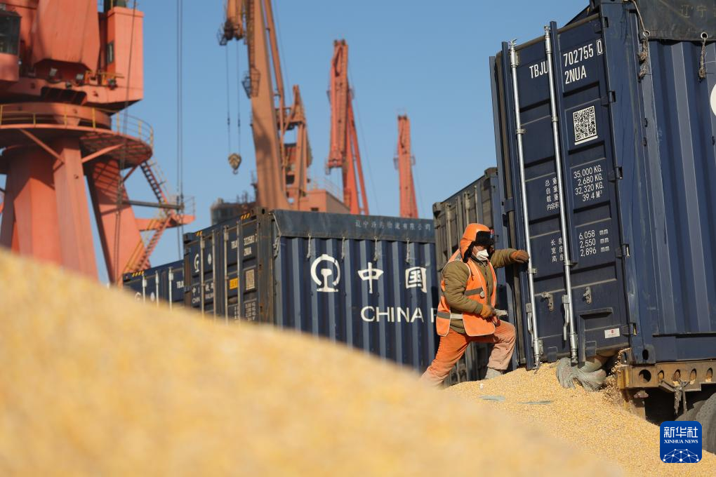 2月18日,在營口港鲅魚圈港區,裝滿玉米的敞頂箱在碼頭卸貨。