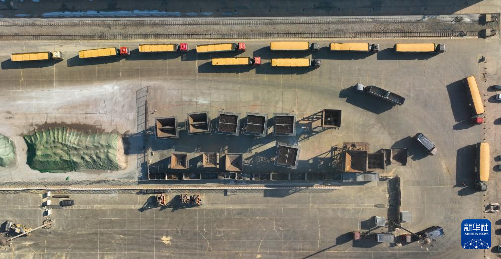 2月18日,在營口港鲅魚圈港區,運輸玉米的敞頂箱車輛在碼頭等待(無人機照片)。