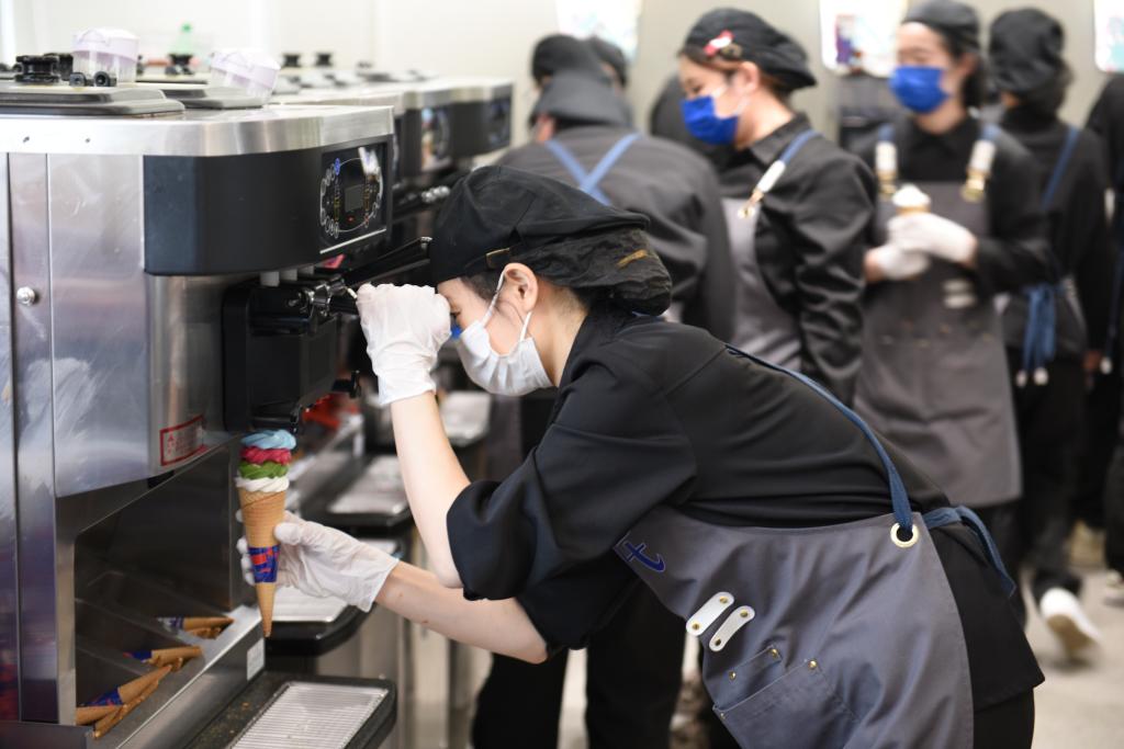 記者看到,最受歡迎的“城市地標甜筒”上疊放著6種顏色、6種口味的冰淇淋,頂端裝飾著一顆鮮紅的櫻桃?!斑@款冰淇淋是我們銷售最火爆的現制產品,每天都有很多顧客專程來排隊購買?!钡率现票鶑S店員年肖說。