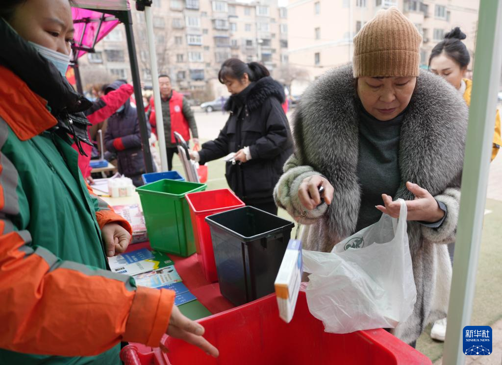 3月4日,在沈陽市鐵西區重工新村社區廣場,志愿者引導居民分類上交過期藥品、廢舊電池等,兌換實用的日用品。