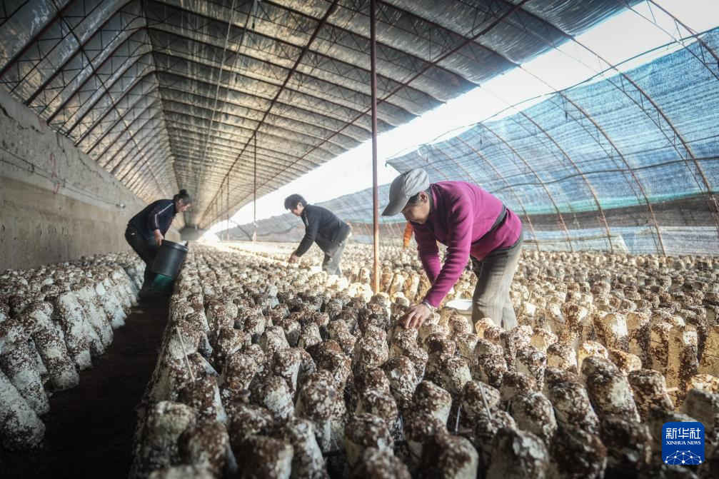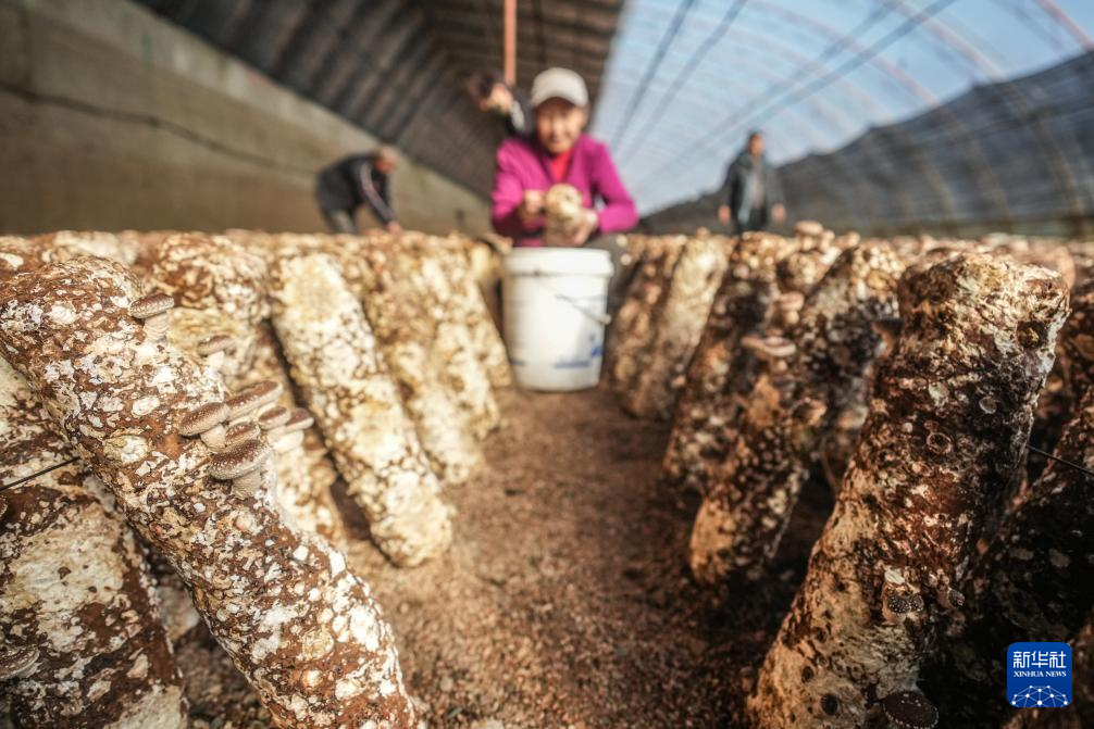 3月6日,在遼寧省葫蘆島市建昌縣,種植戶在香菇種植大棚采收香菇。