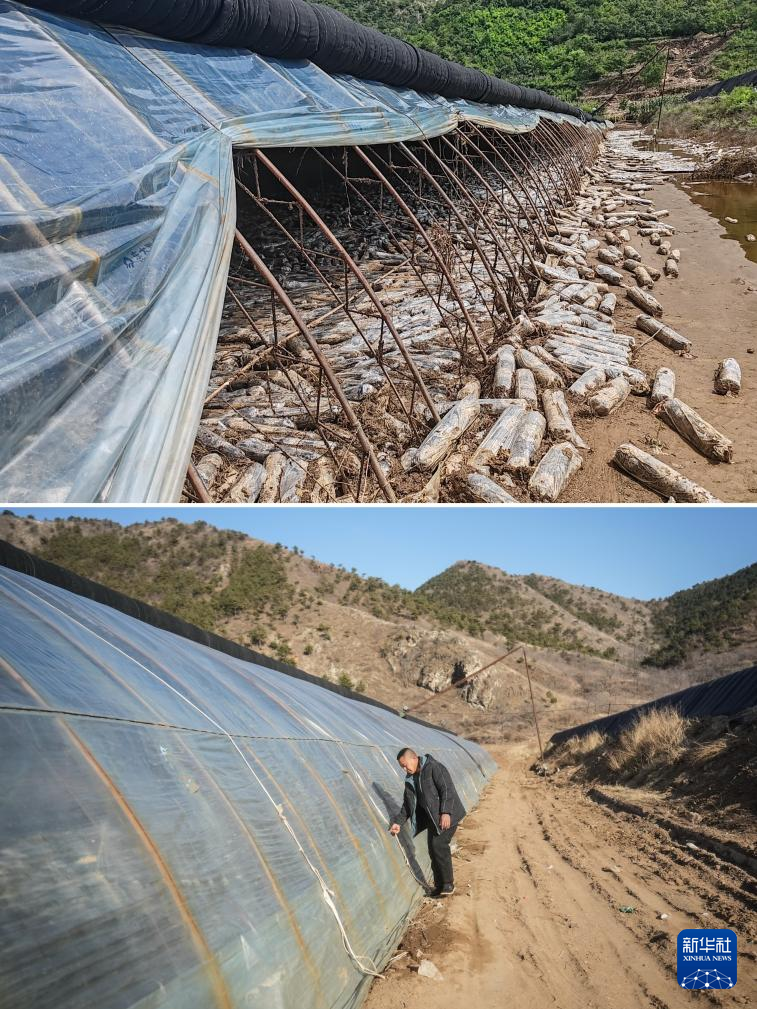 拼版照片:上圖為2024年8月25日在遼寧省葫蘆島市建昌縣拍攝的被洪水沖毀的香菇種植大棚(新華社發);下圖為2025年3月6日,建昌縣種植戶在香菇種植大棚外檢查大棚膜(新華社記者 潘昱龍 攝)。