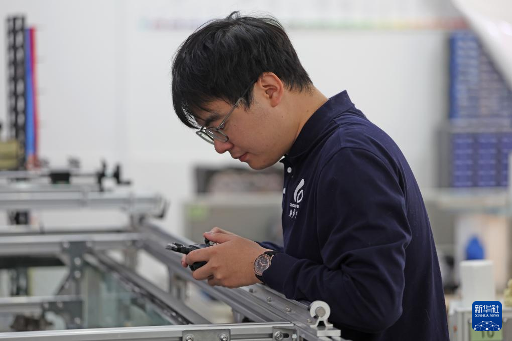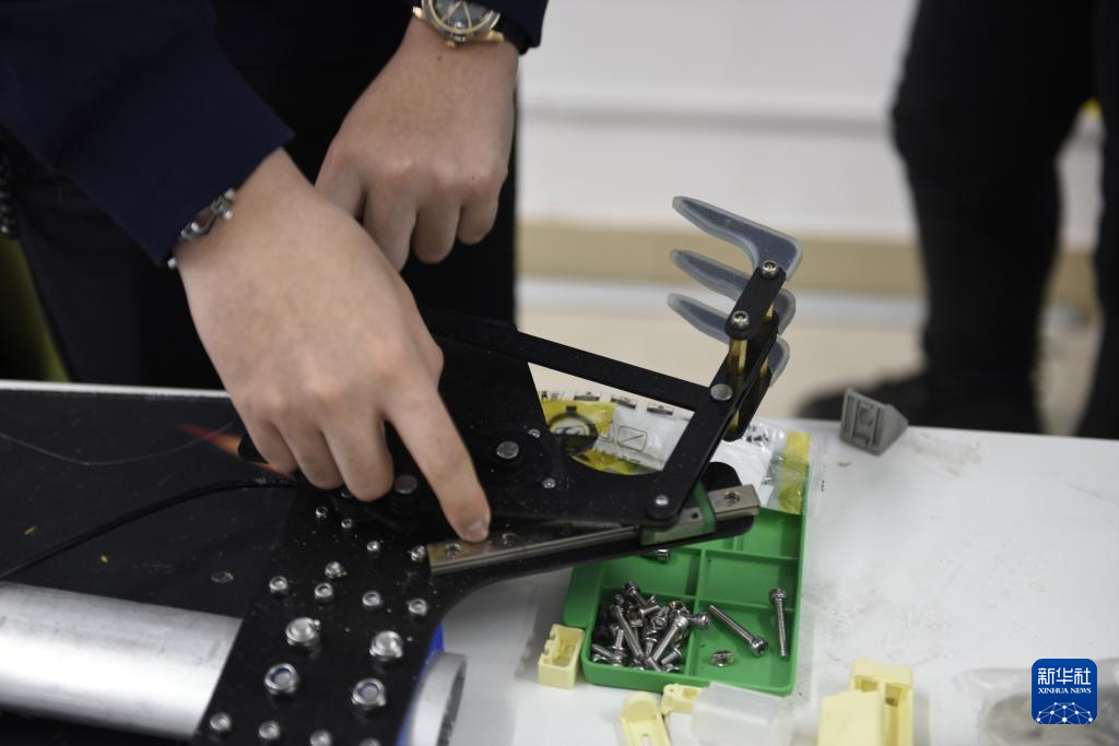 3月18日,儲逸塵在沈陽粼動仿生科技有限公司內組裝水下仿生機器人機械爪。新華社記者 吳青昊 攝