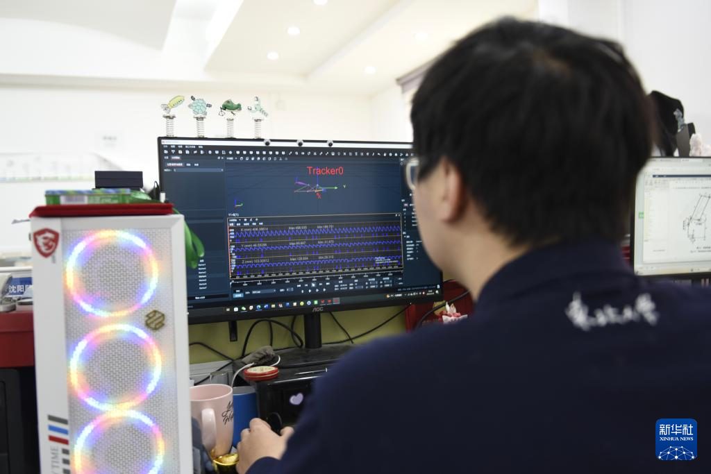 3月18日,儲逸塵在沈陽粼動仿生科技有限公司內監測水下仿生機器人運動軌跡。新華社記者 吳青昊 攝