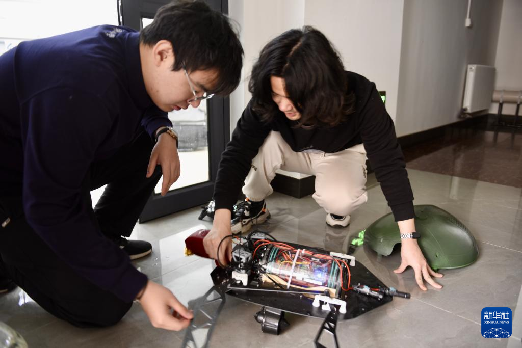 3月18日,儲逸塵(左)和同事在沈陽粼動仿生科技有限公司內組裝兩棲仿生海龜機器人。