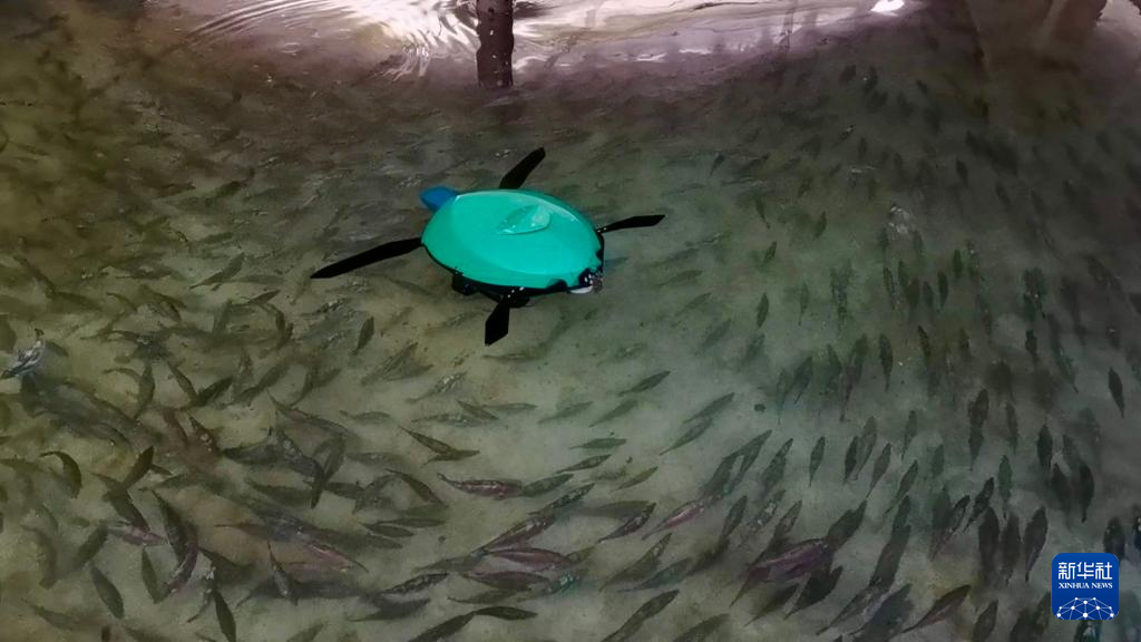 在大連一家漁業養殖場內拍攝的兩棲仿生海龜機器人(2024年5月3日攝)。新華社發