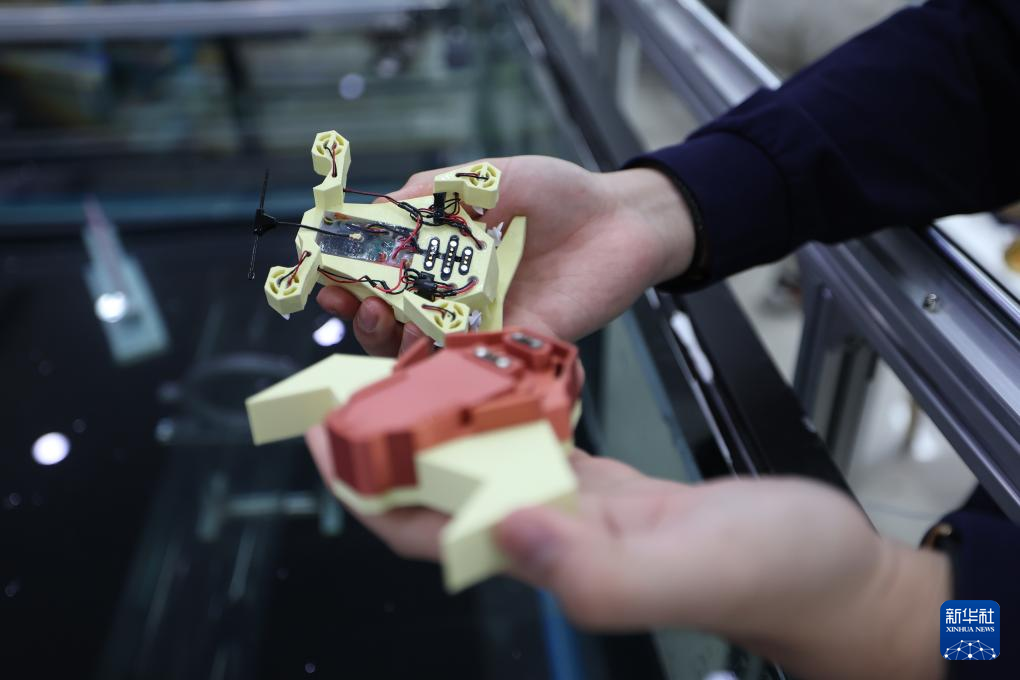 3月18日,儲逸塵在沈陽粼動仿生科技有限公司內展示水下仿生機器人。新華社記者 楊青 攝