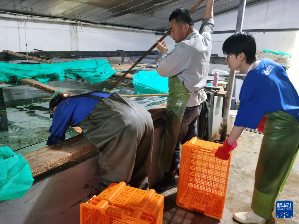 在大連一家漁業養殖場內,沈陽粼動仿生科技有限公司工作人員放置兩棲仿生海龜機器人(2024年5月3日攝)。新華社發