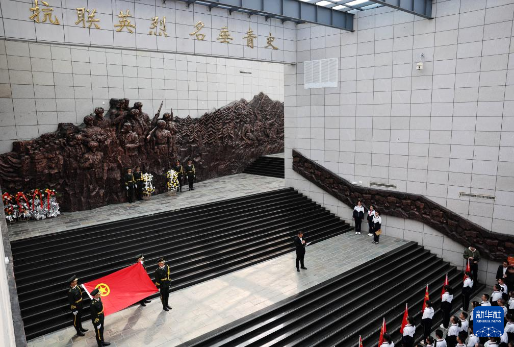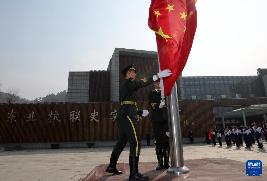 4月3日,抗聯中學學生在東北抗聯史實陳列館門前舉行升旗儀式。