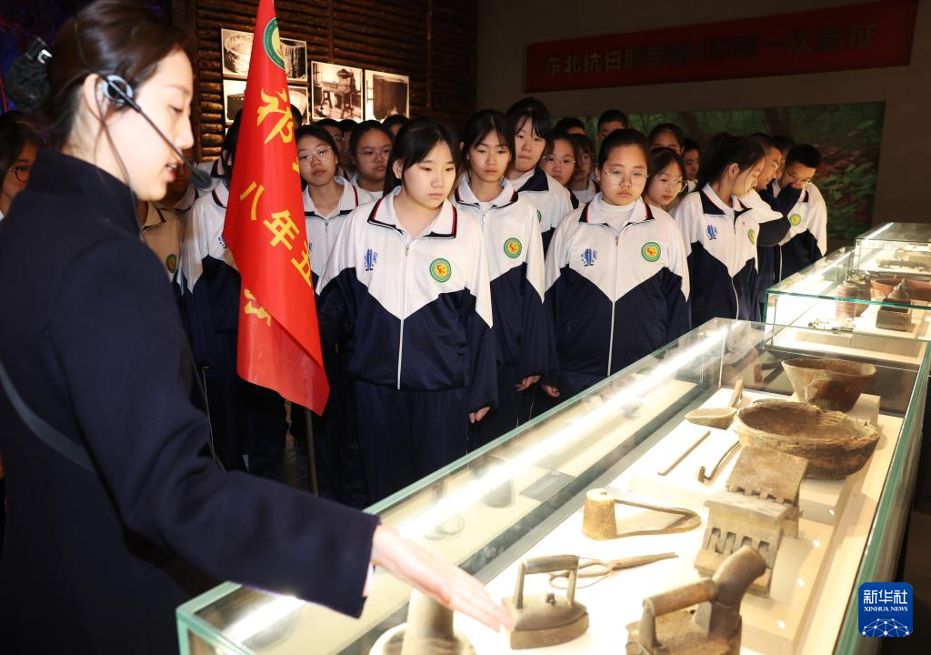 4月3日,抗聯中學學生在東北抗聯史實陳列館參觀。