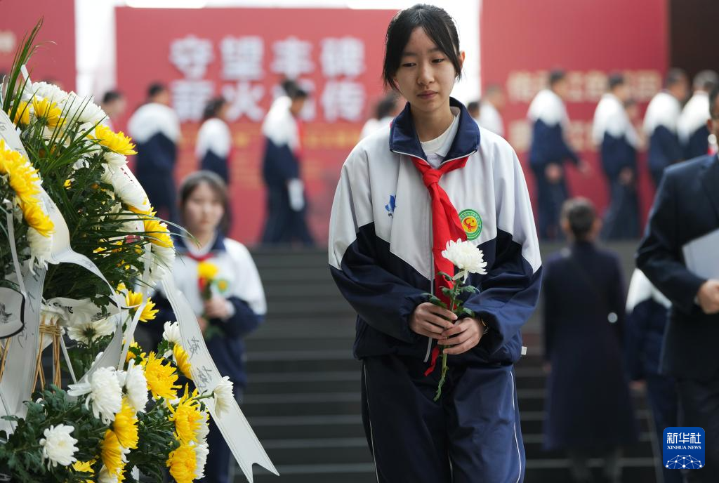 4月3日,抗聯中學學生在東北抗聯史實陳列館給英烈獻花。