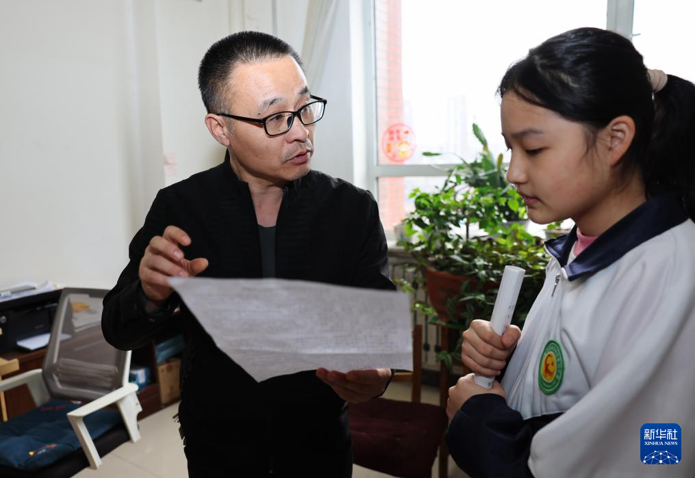 抗聯中學團委書記王浩(左)指導參加抗聯英雄故事演講的學生(4月2日攝)。