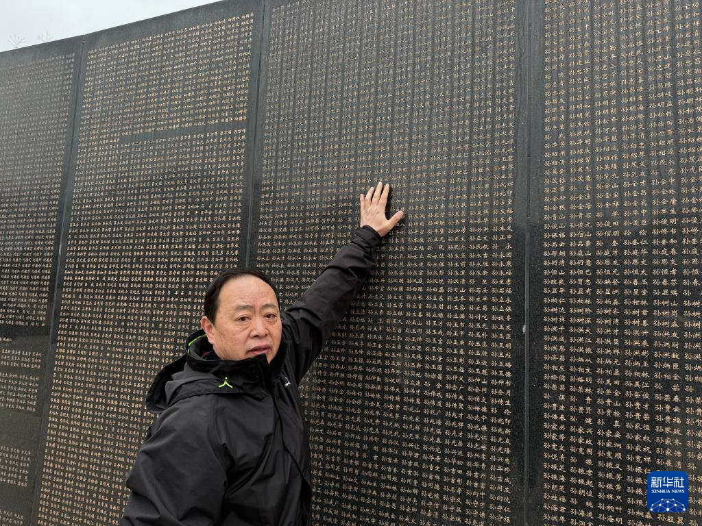 圖為孫勝德指著烈士英名墻上“孫世安”烈士的名字。新華社記者洪可潤 攝