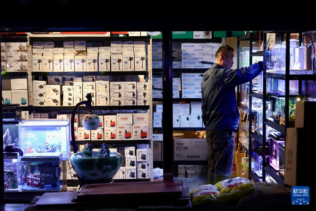 4月10日,在鞍山三臺子觀賞魚交易中心,一名店主在布置魚缸。