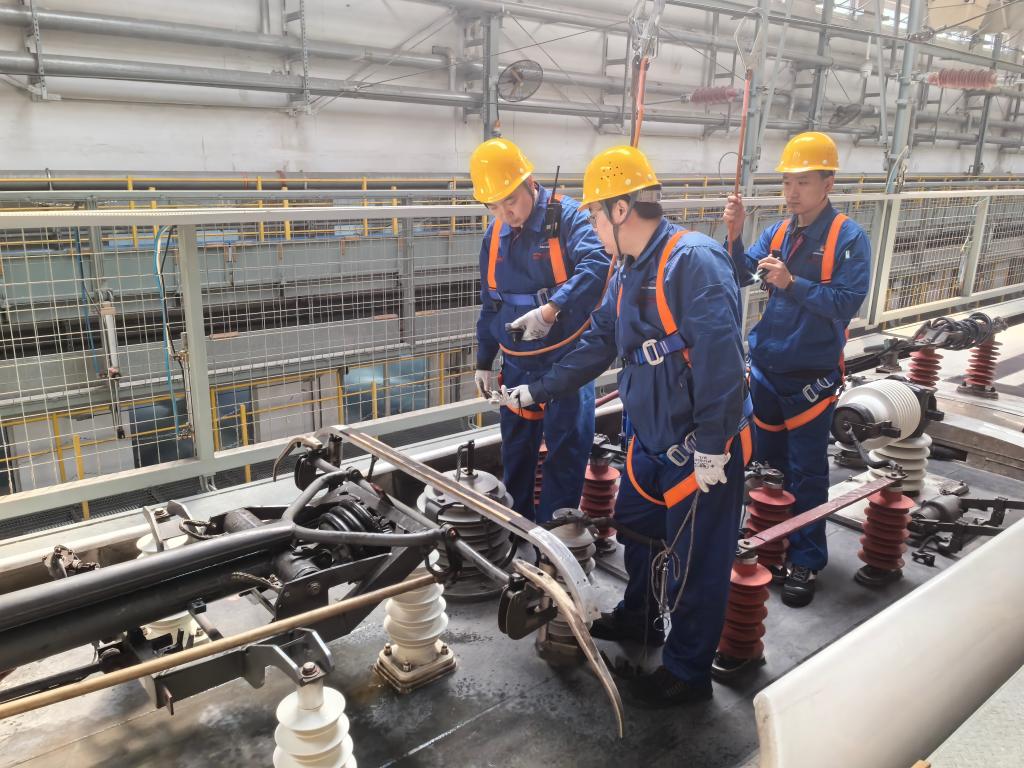 國鐵沈陽局沈陽動車段為動車安裝金屬滑板,應對接觸網覆冰隱患。(國鐵沈陽局供圖)