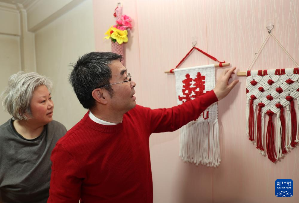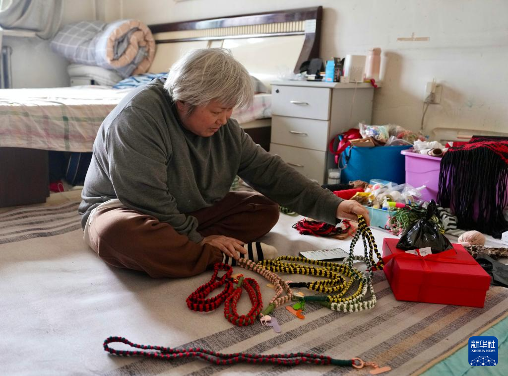 4月7日,楊姐在家中制作手機鏈。