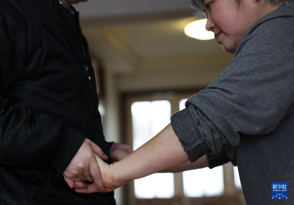 4月10日,吳哥在家中幫助楊姐做康復鍛煉。