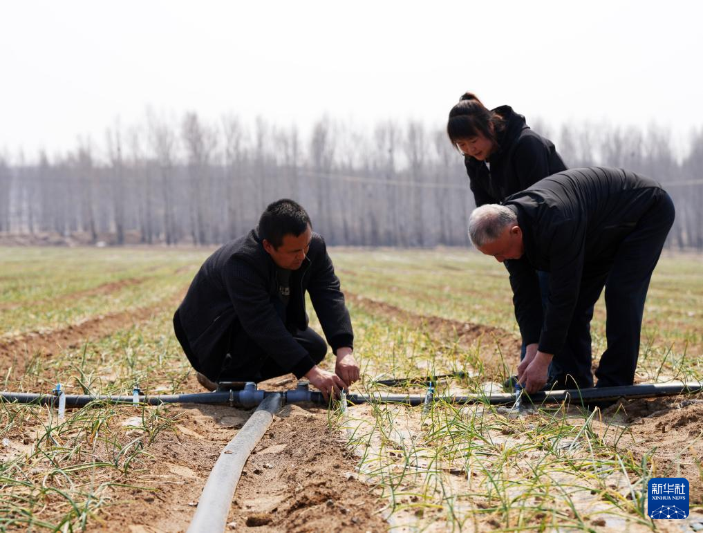 4月15日,在遼寧省阜新蒙古族自治縣于寺鎮官營子村,村民在檢查圓蔥種植地里的滴灌帶。