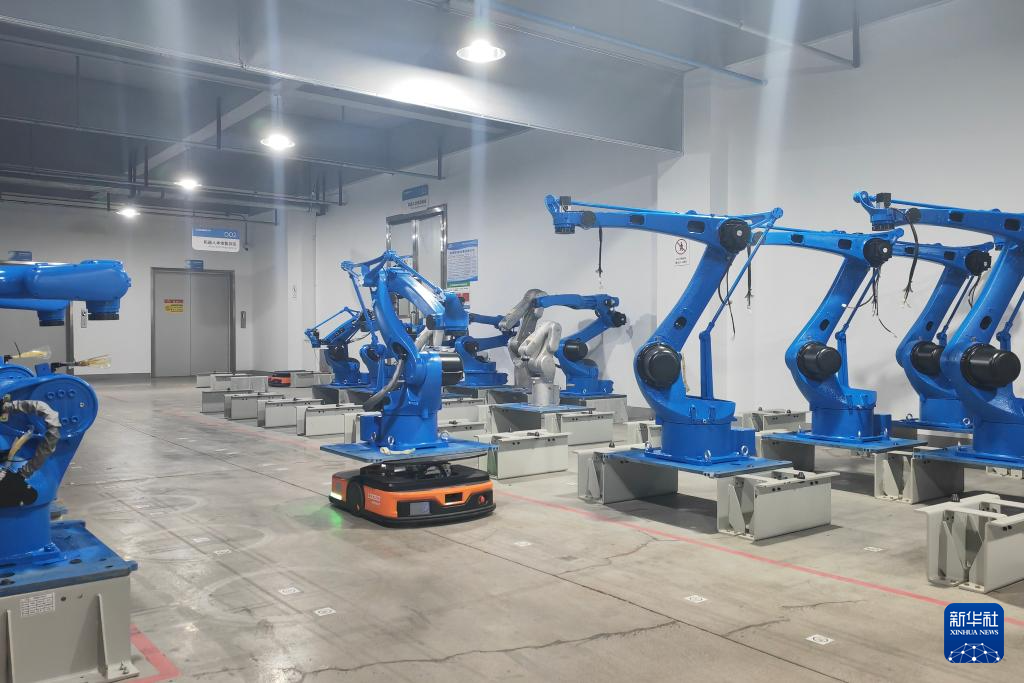 4月23日,成都卡諾普機器人技術股份有限公司生產車間,AGV機器人正轉運生產下線的工業機器人。新華社記者李力可攝