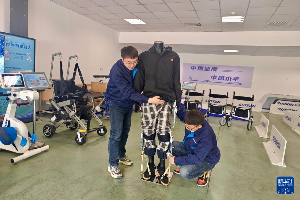 4月24日,沈陽新松機器人自動化股份有限公司醫療與服務機器人事業部行業經理叢朝陽(左一)在演示無源可穿戴式下肢助行器。新華社記者王瑩攝