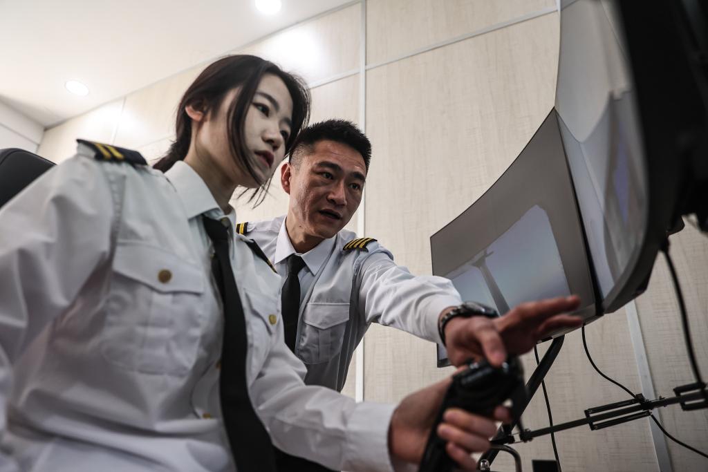 4月25日,在遼寧省沈陽市法庫縣,學員(左)在遼寧眾智益昇航空飛行學院參加輕型運動飛機的飛行培訓。