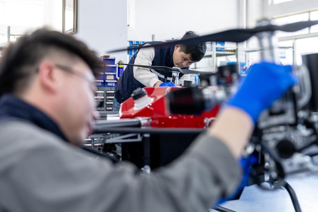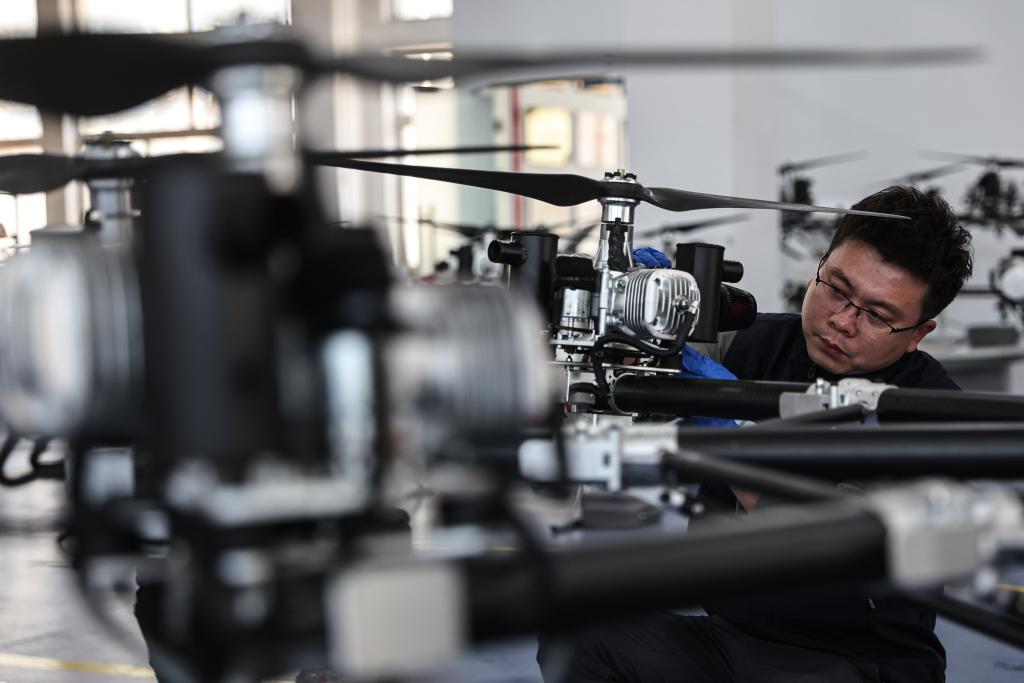 4月25日,在遼寧省沈陽市法庫縣,工程師在法庫中軍翼無人機科技有限公司的研發組裝車間組裝無人直升機。