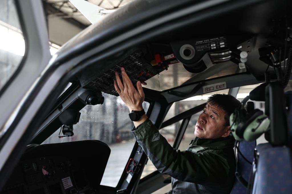 4月25日,在遼寧省沈陽市法庫縣,遼寧通飛通用航空有限公司負責人在機庫對一架直升機進行例行檢查,該直升機可應用于應急救援、航拍航測等場景。