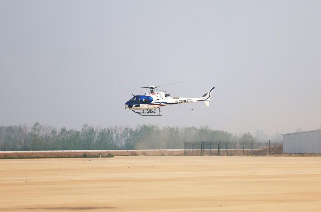 4月26日,在遼寧省沈陽市法庫縣,一架直升機從沈陽法庫通用航空產業基地起飛,準備進行護林作業。