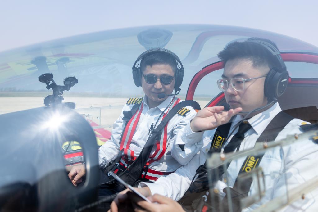 4月26日,在遼寧省沈陽市法庫縣,學員(右)在遼寧眾智益昇航空飛行學院參加輕型運動飛機的飛行培訓。