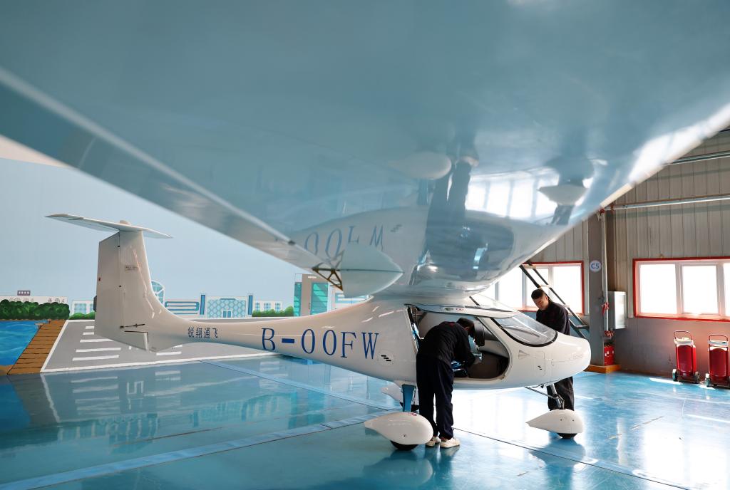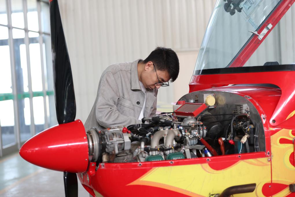 4月25日,在遼寧省沈陽市法庫縣,工程師在遼寧聯航神燕飛機有限公司的生產線做航空器的日常維護。