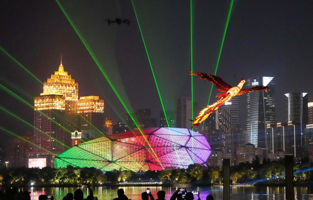 這是在沈陽市渾河上進行的“鳳凰飛天”的無人飛行器表演(2024年10月7日攝)。