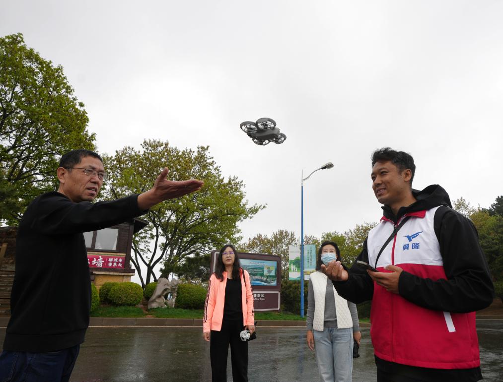 5月9日,在大連童牛嶺風景區,遼寧翼隆通用航空有限公司的工作人員(右)幫助游客體驗共享無人機。