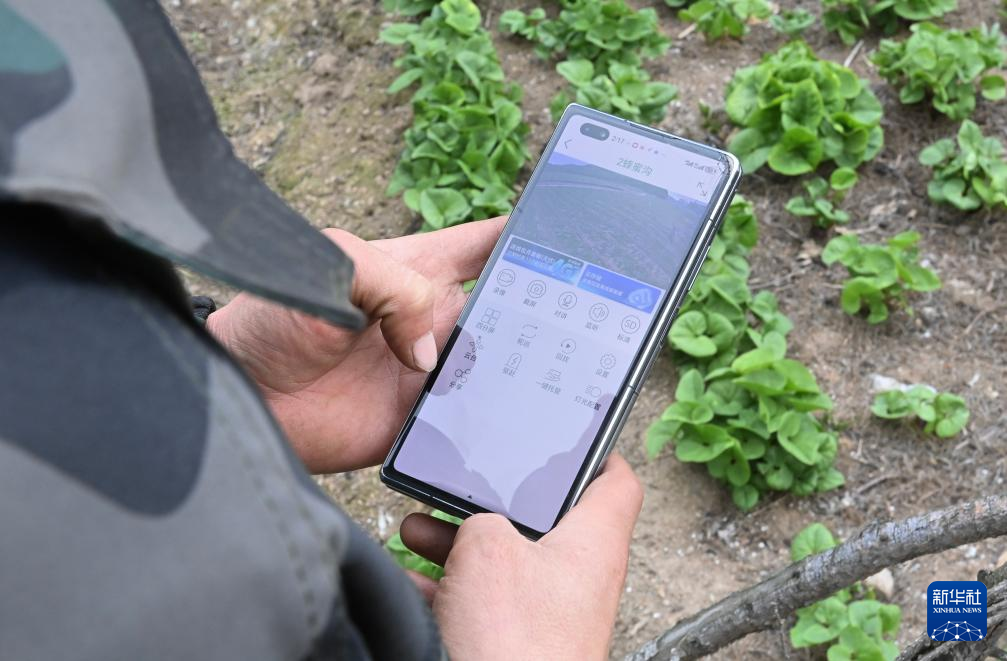 5月14日,在遼寧省撫順市新賓滿族自治縣,一名種植戶用手機監控查看遼細辛長勢。