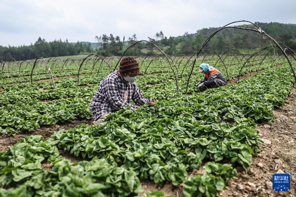 5月14日,在遼寧省撫順市新賓滿族自治縣,一家生產遼細辛企業的工作人員在種植基地進行日常維護工作。