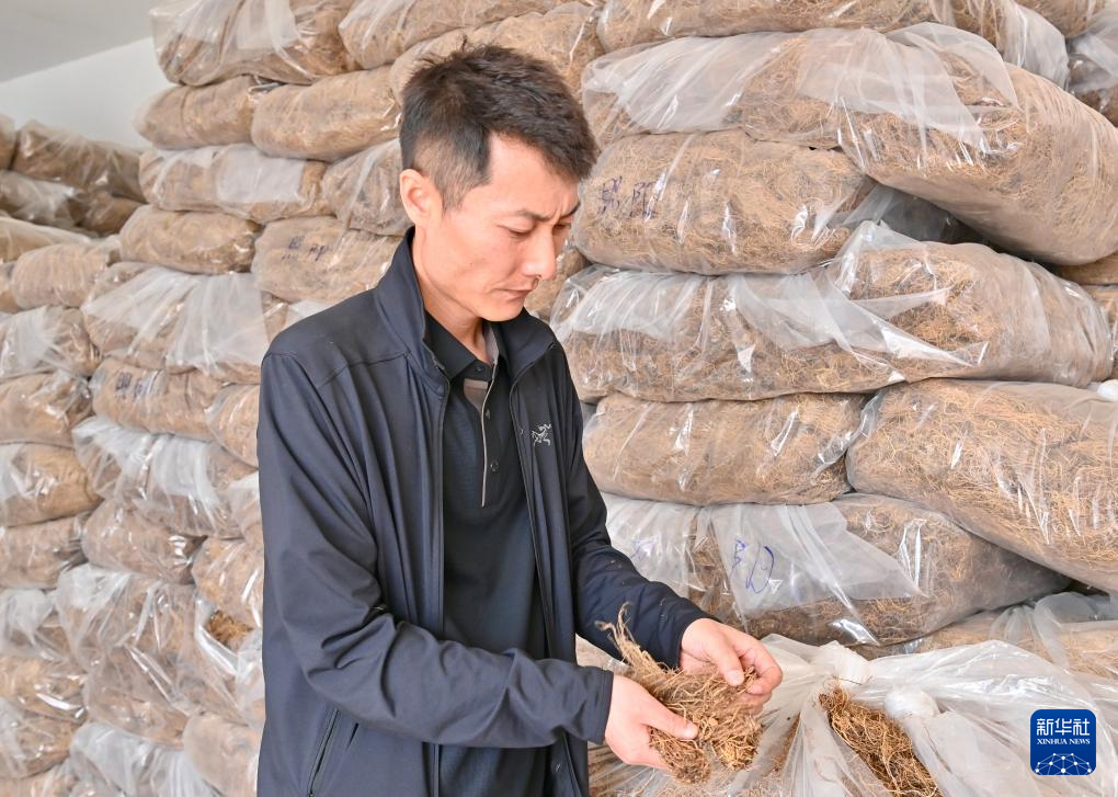 5月14日,在遼寧省撫順市新賓滿族自治縣,辰軒中藥材經營有限公司負責人在倉庫里檢查遼細辛品質。