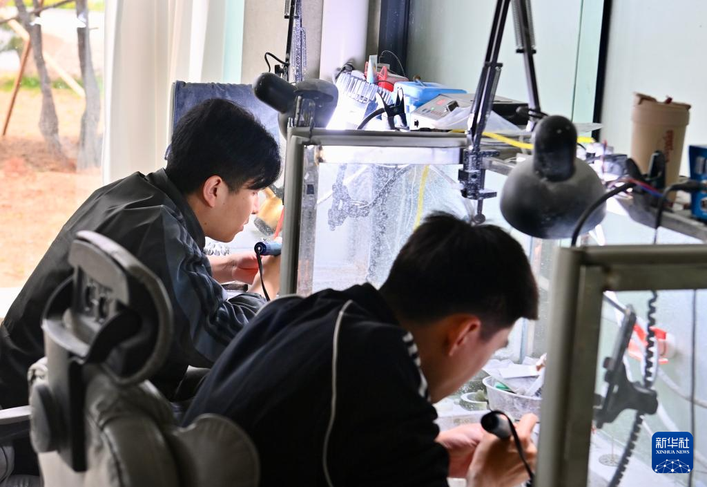5月20日,唐校(左)和父親唐帥在“玉三生”工作室內切磋岫玉雕刻技藝。