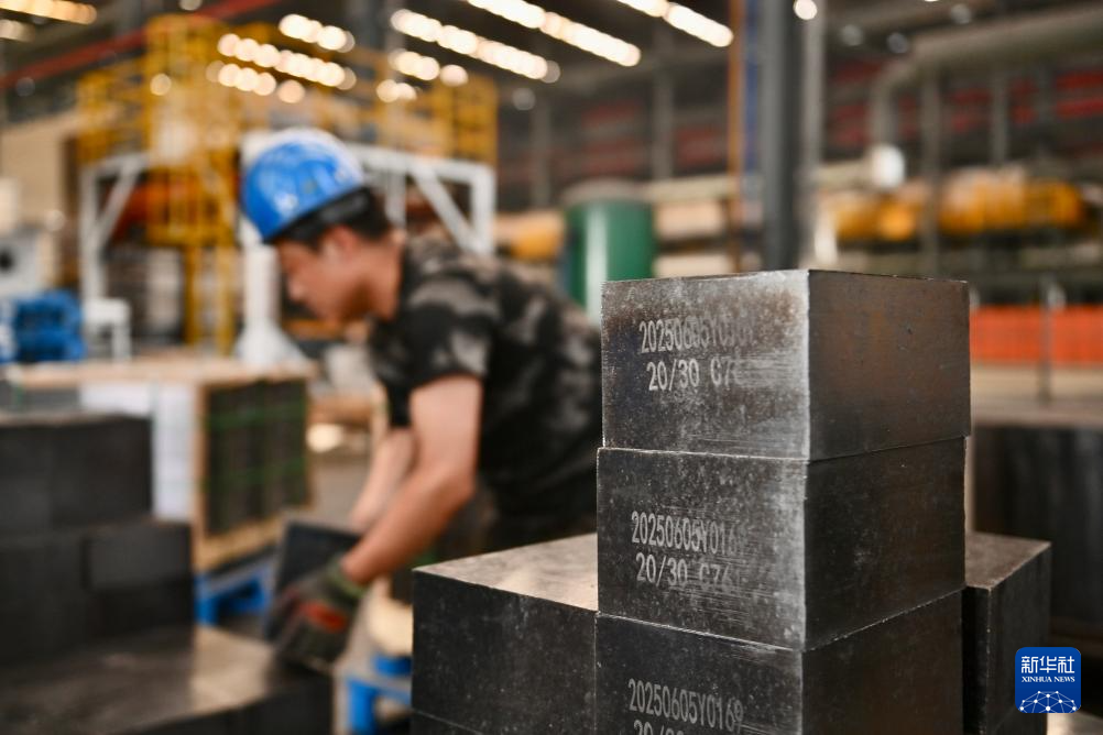 6月6日,工人在海城利爾麥格西塔材料有限公司搬運鋼包鎂碳磚。