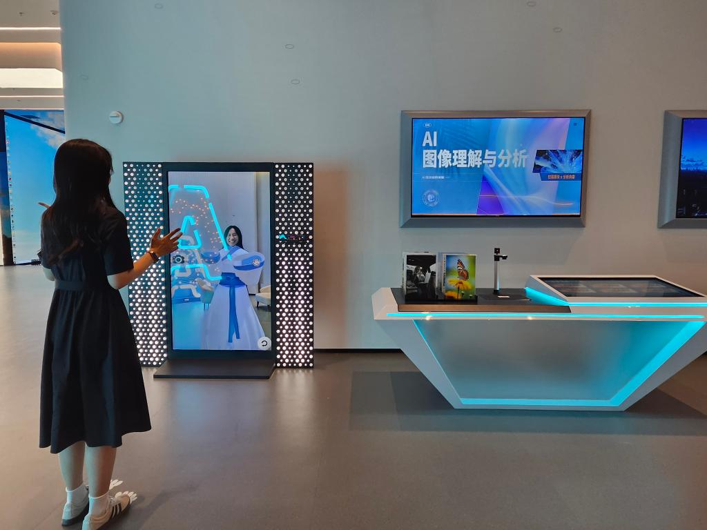 按下按鈕,咖啡機器人便扭動著兩條機械臂,自如地完成磨咖啡豆、接粉取水、三段式沖煮等流程,端上一杯香氣四溢的美式咖啡;站在“換裝魔鏡”前,隔空擺動手勢就可以更換“身上”的衣服;在大屏幕上輸入指令,可以讓圖片秒變視頻……