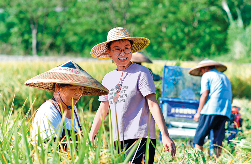 貴州省岑鞏縣注溪鎮周坪村黨支部副書記侯佳媛(左二)在幫助村民收割雜交水稻(2024 年 9 月 27 日攝)楊文斌攝 / 本刊