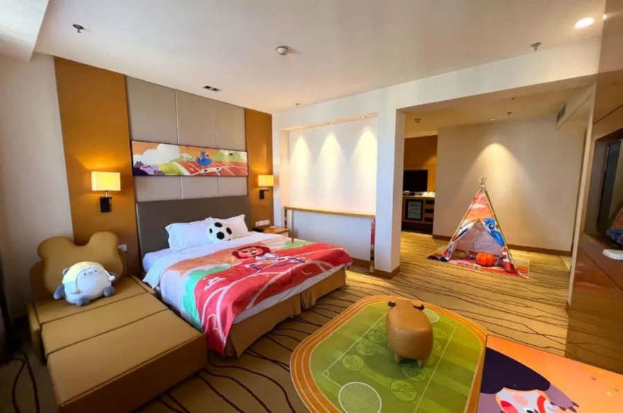 假日酒店親子房,像把五彩繽紛的世界呈現在眼前,身在其中仿佛進入到心中幻想的童話世界。無論從墻壁、床、衛生間到抱枕,都經過了精心的設計,配上憨態可掬的公仔玩具,讓小朋友愛不釋手。