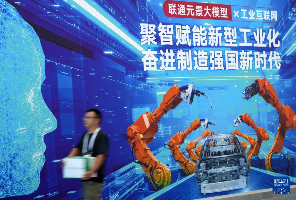 9月5日,在沈陽的2025全球工業互聯網大會的展覽區現場,一名工作人員走過廣告板。