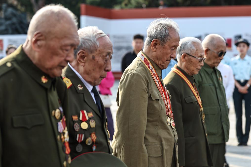 9月10日,抗美援朝老戰士在祭奠活動中默哀。