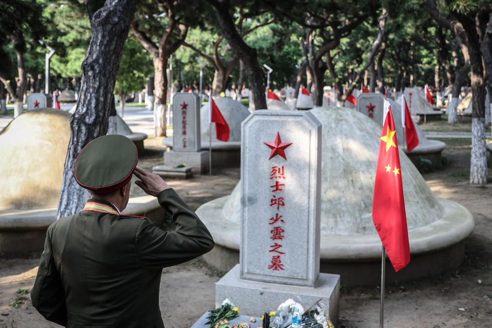 9月10日,抗美援朝老戰士向烈士墓敬禮。