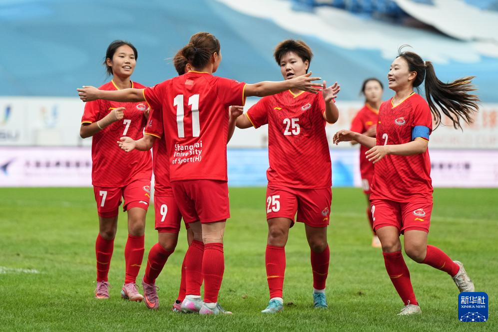 9月17日,上海體育大學女足球員慶祝進球。新華社記者 鄭煥松 攝
