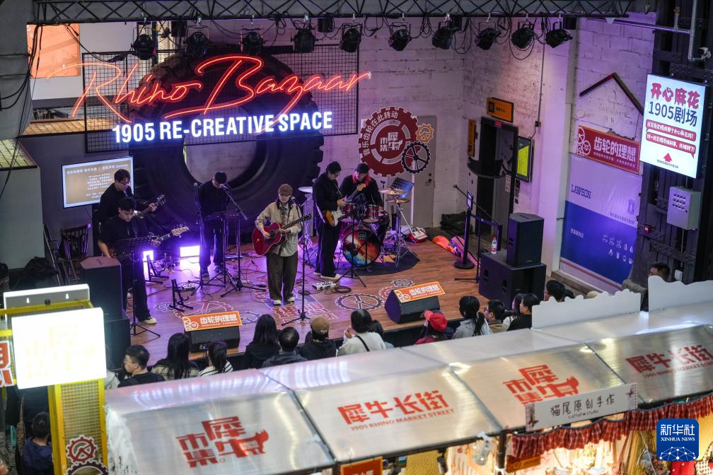 10月6日,游客在沈陽1905文化創意園內觀看樂隊演出。