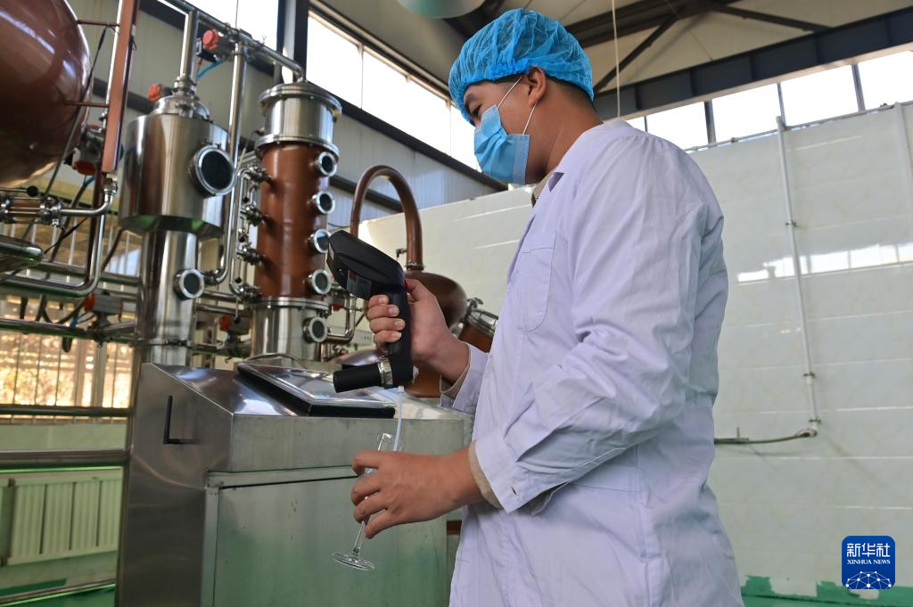 10月21日,在海城市馬風鎮一家南果梨酒廠內,工人在蒸餾間檢測樣品酒精含量。