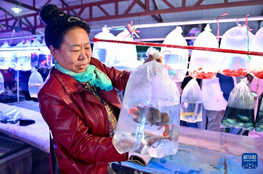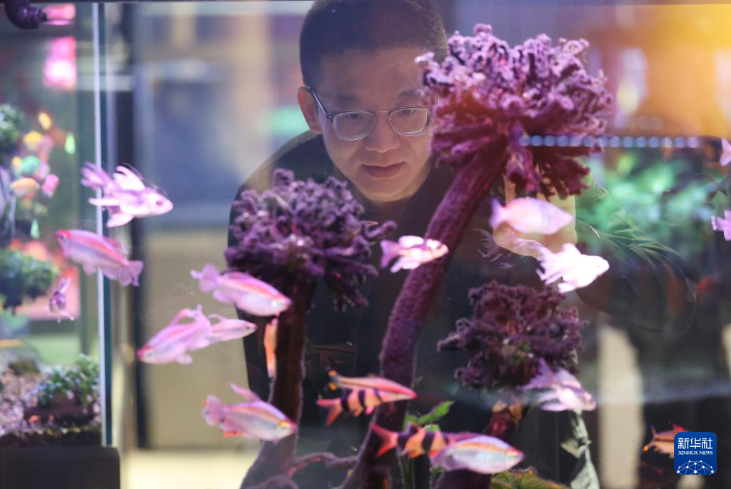 4月10日,在鞍山三臺子觀賞魚交易中心,一名商戶展示自家售賣的觀賞魚。