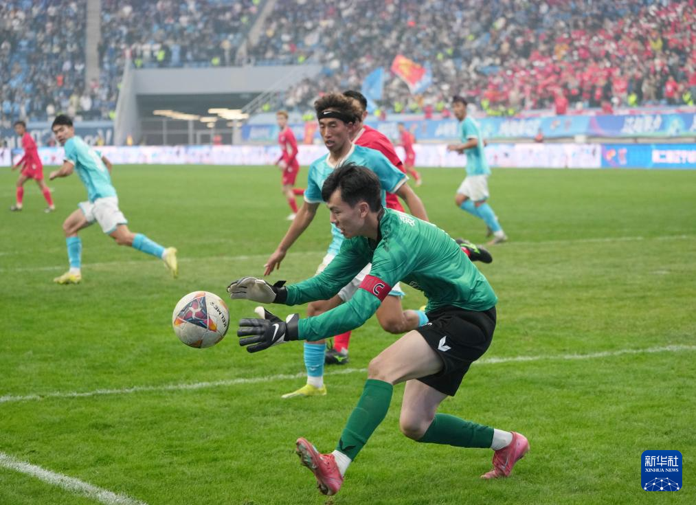 11月15日,大連隊守門員蕭志仁(前)在門前拼搶。